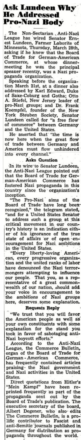 Winchell, Walter. (3 October 1940). Walter Winchell on Broadway [with mention of Sen. Lundeen, the Duke of Saxe-Coburg and Gotha at event at Waldorf-Astoria hotel in March 1940, and German-Bund publication about it]. The Waterbury Democrat, p. 13. (P03465).