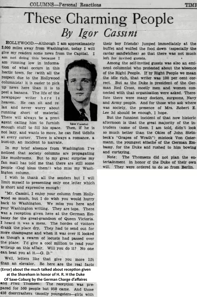 Just before the invasion of Holland [Thomsen] gave his last big reception. It was held in the Mayflower hotel, ostensibly in honor of the Duke of Saxe-Coburg, president of the German Red Cross. Washington society attended en masse—partly because the Thomsen champagne has a reputation—partly because the Duke of Saxe-Coburg happens also to be a grandson of Queen Victoria…” (Excerpts from above.)