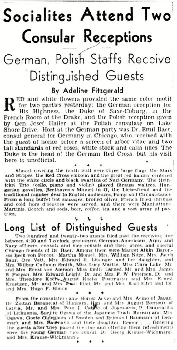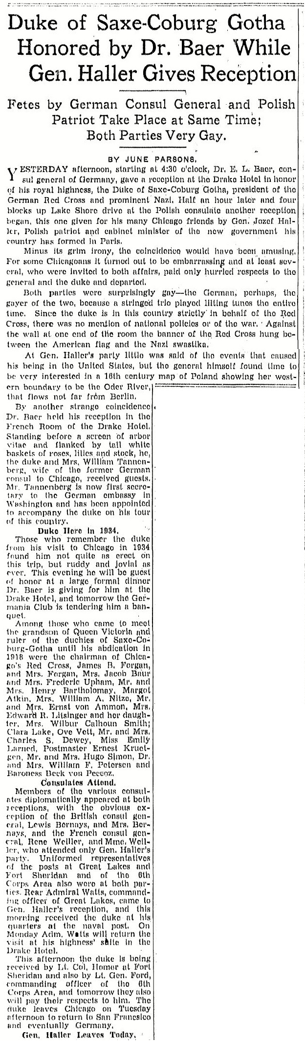 "Duke Carl Eduard of Saxe-Coburg, president of the German Red Cross, was a visitor in Palm Springs today, accompanied by Consel [sic] General H. G. Stahmer of the Foreign Office, Berlin; Capt. F. Von Grolmann, personal aide to Duke Wilhelm Tannenberg, First Secretary of the German Embassy, Washington, and Dr. George [sic] Gyssling, German Consel [sic] Los Angeles.