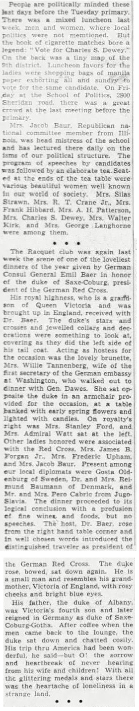 You’d be a-m-a-z-e-d at the excitement the coming of Germany’s might Grand Duke has created in national and local circles. This member of Germany’s diplomatic family has NOT been overlooked. Sharing honors today are his aide-de-camp, Capt. Baron von Grolman; Consul General Dr. Stahmer from the Berlin Foreign Office, and Dr. W. Tannenberg…