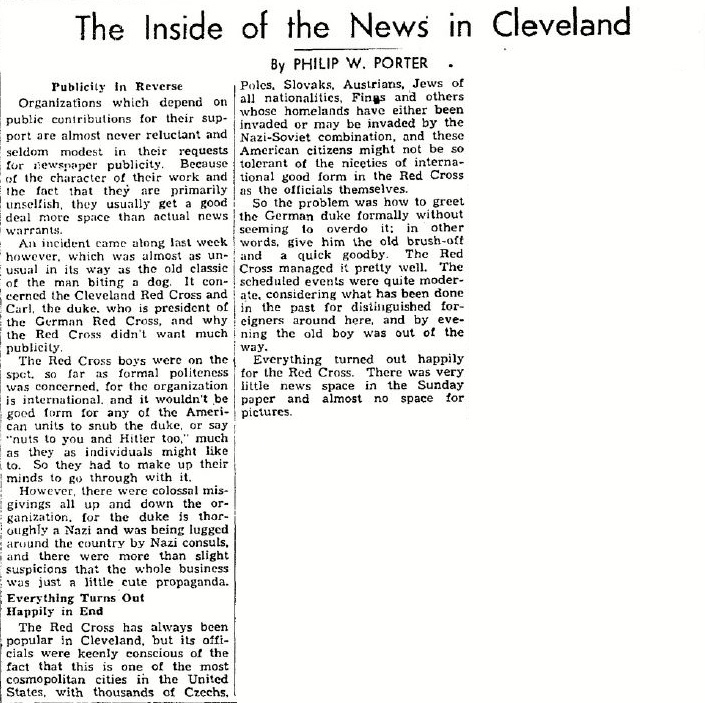 The Duke was put forth into the media as [a] a British royal, grandson of Queen Victoria; then [b] the Head of the German Red Cross, attending the Red Cross convention in Cleveland, and then [c] part of the Nazi regime. The press coverage across America varied, with some not mentioning Nazi at all.