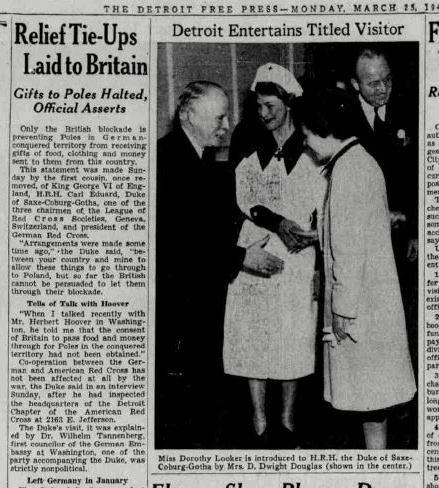 UP (Riverside, Calif, April 5). (6 April 1940). German Red Cross president tours [Other sources have the Duke arriving on April 4]. Nevada State Journal, p. 6. (P03548).
