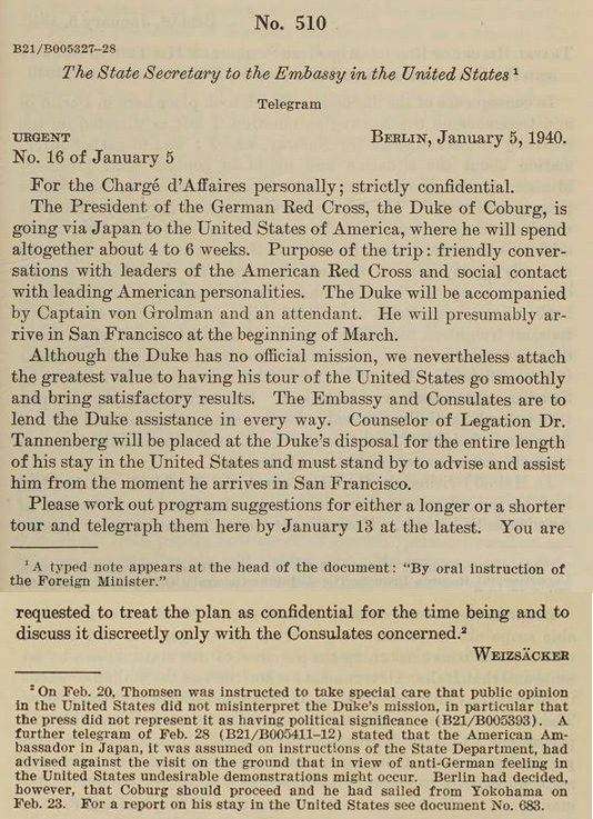 (1 February 1940, Berlin). Memorandum by the Head of Political Division [secret]; Subject: The policy of Japanese Ambassador Kurusu [in point 7 on p. 731, mention that the Duke and Heinrich Stahmer were leaving that evening for Japan], (document no. 590). In Documents on German Foreign Policy 1918-1945, Series D (1937-45), Vol. 8, (The War Years) (September 4, 1939 - March 18, 1940) (Publication 5436) (1954), pp. 728-32. (U. S.) Department of States / United States Government Printing Office, Washington, DC. (S02204).