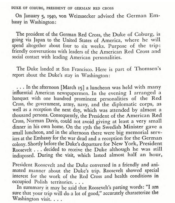 Do get ready for a shock if you don’t know about the British royal / Hitler ally, the Duke of Saxe-Coburg and Gotha. After WWII, some historians associate him with the policy of exterminating the mentally and physically disabled in a eugenics lane. (What was known about that, if anything, during the trip needs research.) The Duke’s propaganda trip that targeted the social set and businessmen gauged appeasement sentiment and took place March-April 1940. An awkward half-hour meeting with President Roosevelt with Charles Edward as the Head of the German Red Cross was a publicity coup for German Nazis, frankly later caused confusion, and noted as such in later captured German intelligence.