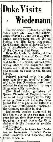 It is also important to note that the Duke of Saxe-Coburg and Gotha was a close ally to the Duke and Duchess of Windsor, Edward and American socialite Wallis Simpson. (The photo above was taken when Duke and Duchess met Hitler in Germany in 1937. To the far right is smiley Fritz Wiedemann, adjutant to Hitler, and later German Consul in San Francisco in 1939-41.)