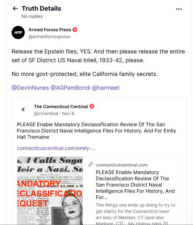 Preece, R. J. (8 November 2025). PLEASE enable Mandatory Declassification Review of the San Francisco District Naval Intelligence Files for history, and for Emily Hall Tremaine. Connecticut Centinal. (Viewed 16 November 2025. S02192).